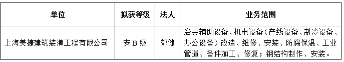 根据《上海市设备维修安装企业安全生产合格证等级评定办法》(沪设协(2018)5号),经上海市设备管理协会维修市场管理办公室评定,对上海美捷建筑装潢工程有限公司拟核发《上海市设备维修安装市场安全生产合格证》,为保证评定工作的公正性,增加工作的透明度,现将该企业拟获合格证的等级和业务开展范围等予以公示,以广泛接受社会监督。公示时间为:2026年4月3日至10日,如有不同意见,请在公示期间以书面形式将反映的情况寄(送)至上海市设备管理协会(邮寄的材料以到达日邮戳为准)。单位反映情况需加盖公章,个人反映情况需签署真实姓名,并留下真实的联系电话、地址和邮政编码。