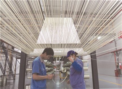 1月8日,在北京人民大会堂召开的2017年度国家科学技术奖励大会上,江苏连云港中复神鹰碳纤维有限责任公司牵头完成的“干喷湿纺千吨级高强/百吨级中模碳纤维产业化关键技术及应用”项目荣获国家科技进步一等奖。东华大学材料学院陈惠芳科研团队联合江苏连云港中复神鹰碳纤维有限责任公司,突破干喷湿纺千吨级高强/百吨级中模碳纤维产业化关键技术,实现了国产碳纤维的批量供应,填补了国内以干喷湿纺工艺为代表的高性能碳纤维生产技术空白,打破了国外高性能碳纤维企业对中国市场的长期垄断。图为工人在中复神鹰碳纤维生产线上关注运行情况。(耿玉和 摄)
