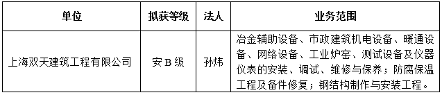 根据《上海市设备维修安装企业安全生产合格证等级评定办法》(沪设协(2018)5号),经上海市设备管理协会维修市场管理办公室评定,对上海双天建筑工程有限公司拟核发《上海市设备维修安装市场安全生产合格证》,为保证评定工作的公正性,增加工作的透明度,现将该企业拟获合格证的等级和业务开展范围等予以公示,以广泛接受社会监督。公示时间为:2026年4月2日至9日,如有不同意见,请在公示期间以书面形式将反映的情况寄(送)至上海市设备管理协会(邮寄的材料以到达日邮戳为准)。单位反映情况需加盖公章,个人反映情况需签署真实姓名,并留下真实的联系电话、地址和邮政编码。